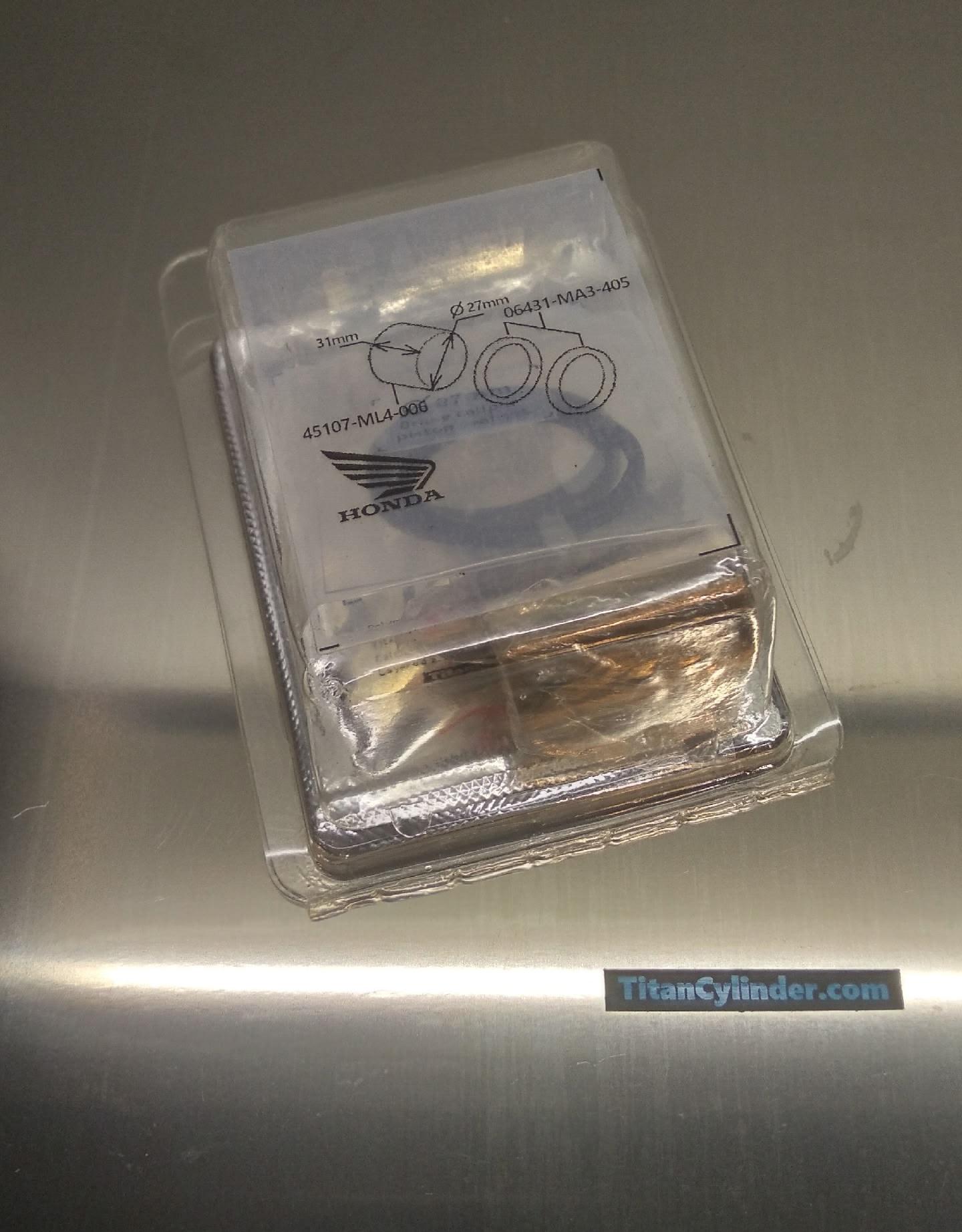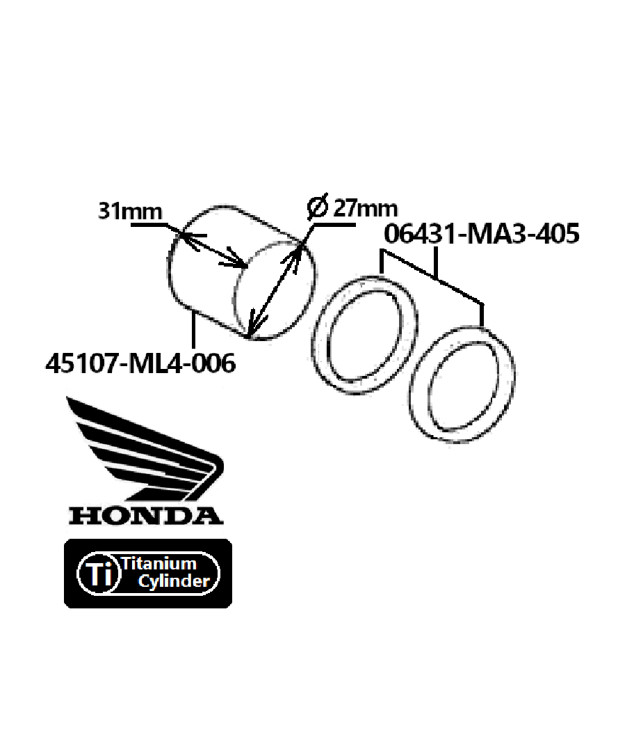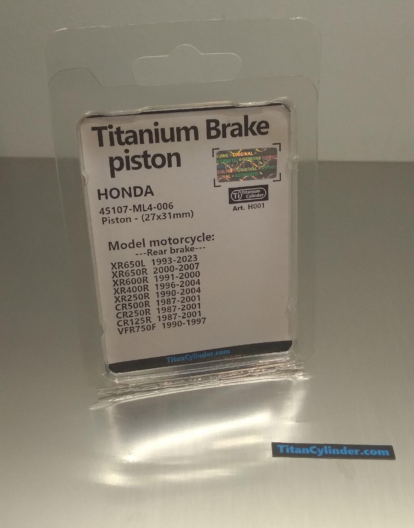 Титановый тормозной поршень. Honda 45107-ML4-006 (Piston 27x31mm) Подходит на задний тормозной суппорт: XR650L 1993-2023 XR650R 2000-2007 XR600R 1991-2000 XR400R 1996-2004 XR250R 1990-2004 CR500R 1987-2001 CR250R 1987-2001 CR125R 1987-2001 VFR750F 1990-1997 --- Рекомендуем перед покупкой измерить свой старый тормозной поршень. Мы указываем размеры поршней на обложке, размеры являются ознакомительными - без сотых миллиметра, но более чем достаточны для того что бы Вы убедились в совместимости ваших моделей. ---