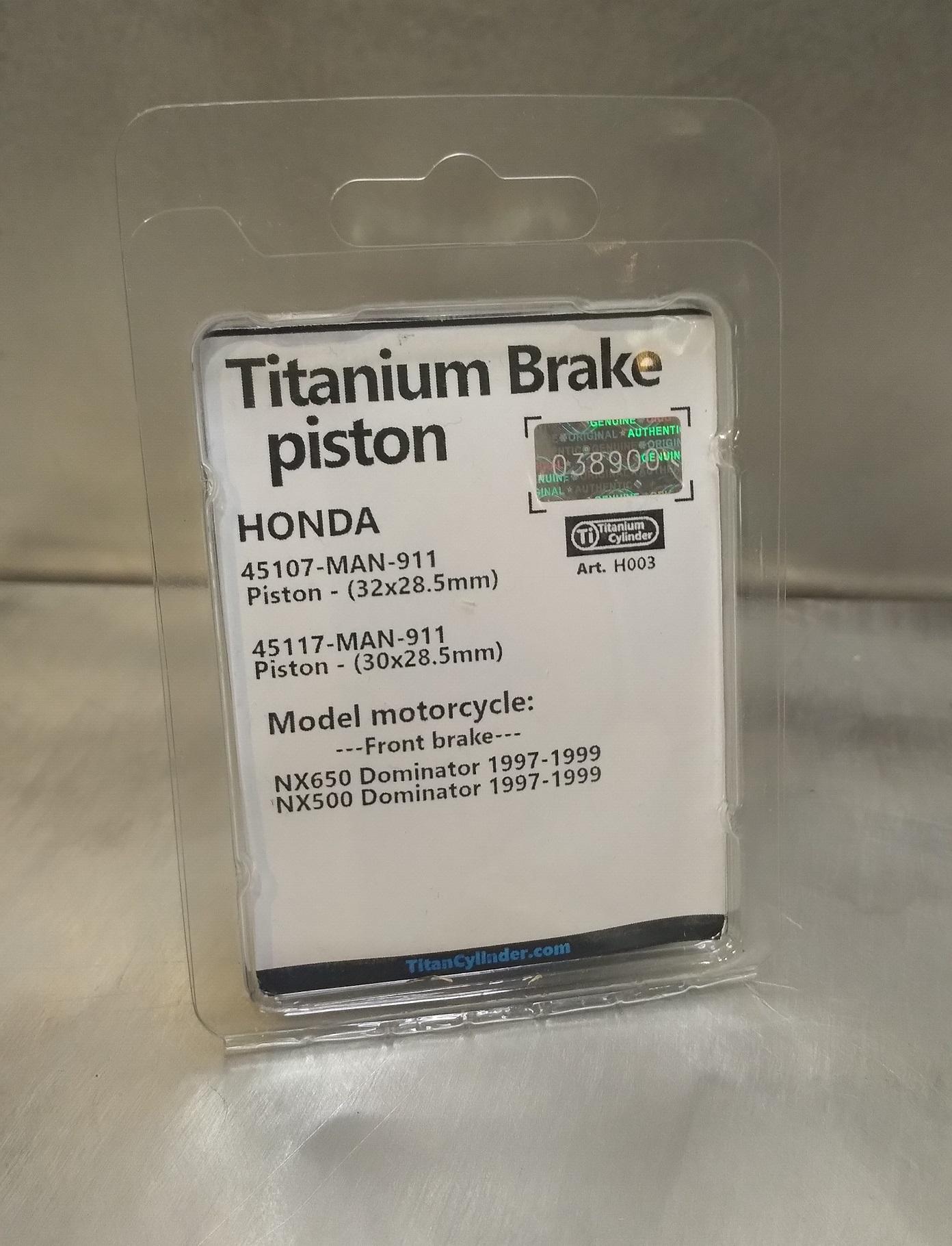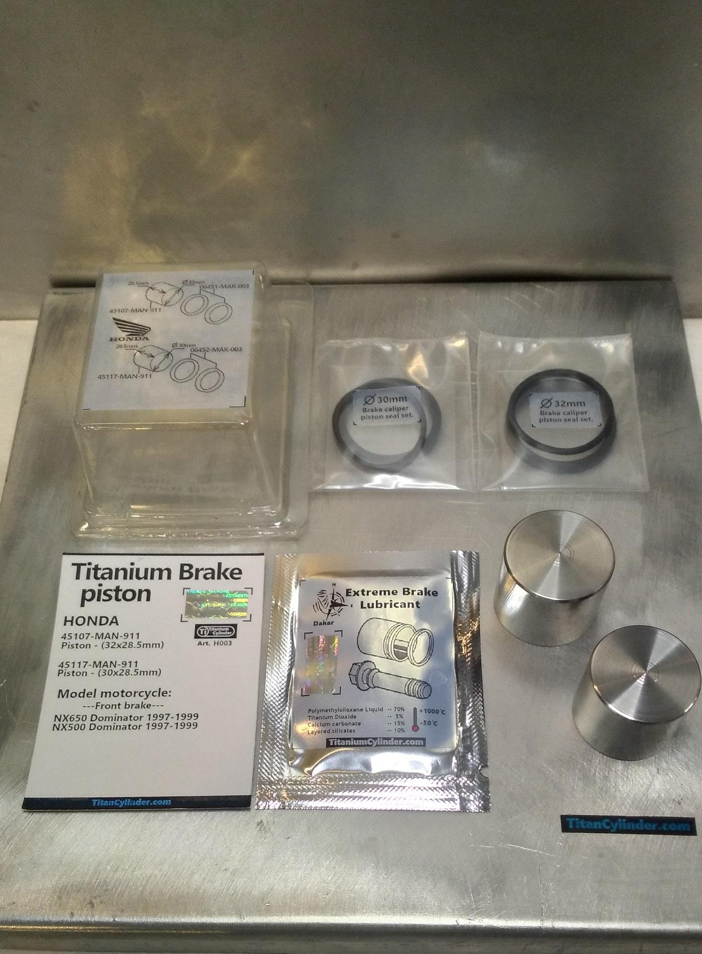 Комплект титановых тормозных поршней на передний тормозной суппорт 45107-MAN-911 Piston - (32x28.5mm) 45117-MAN-911 Piston - (30x28.5mm) Подходит на передний тормозной суппорт: NX650 Dominator 1997-1999 NX500 Dominator 1997-1999