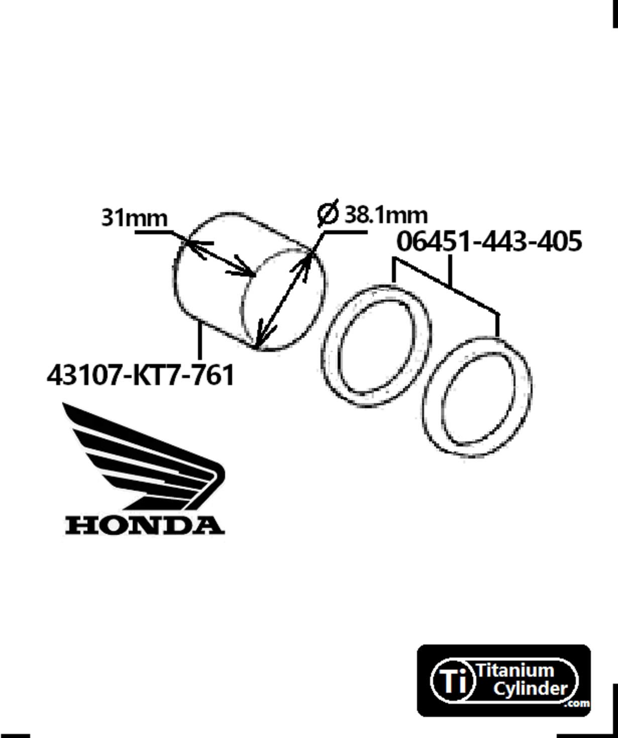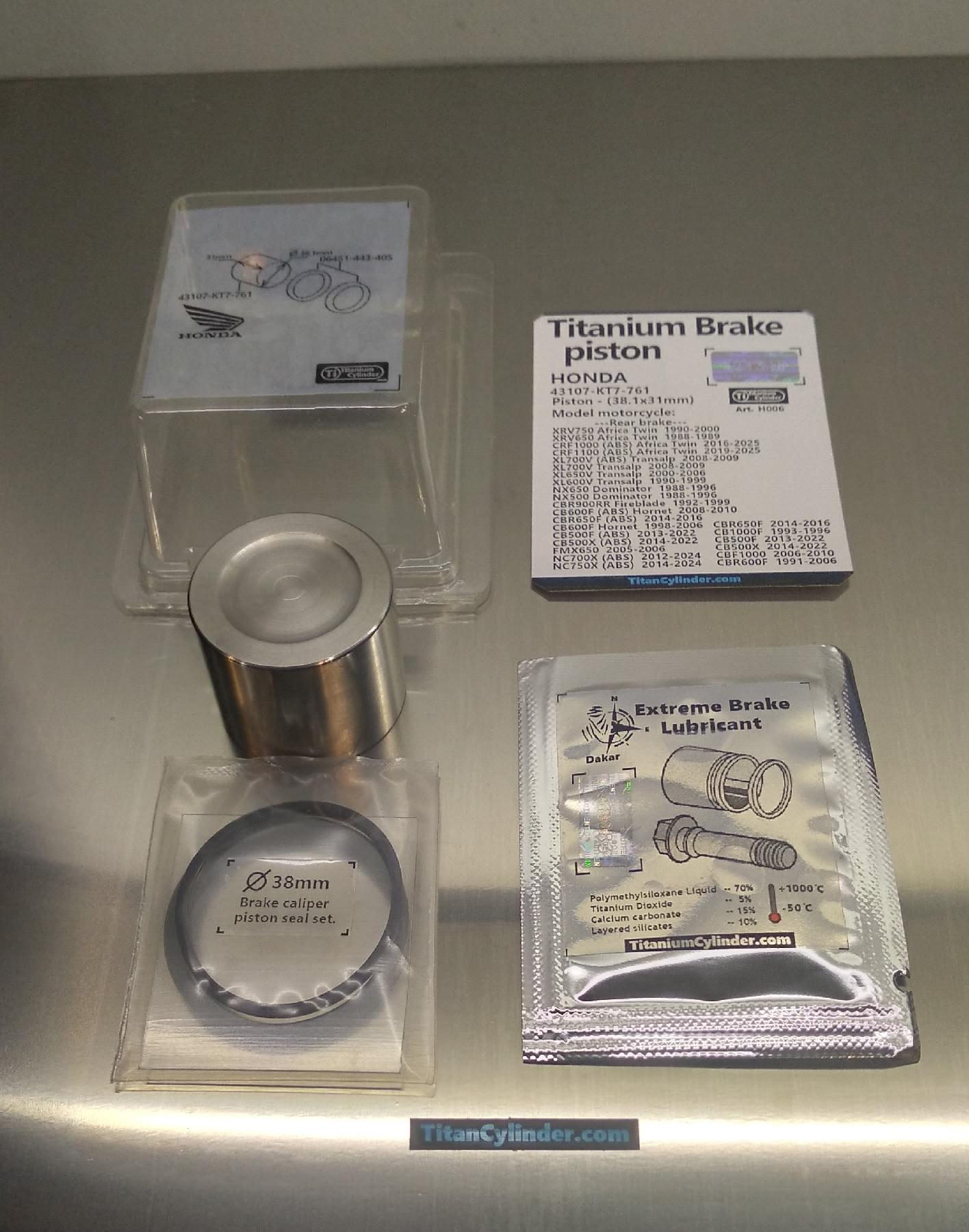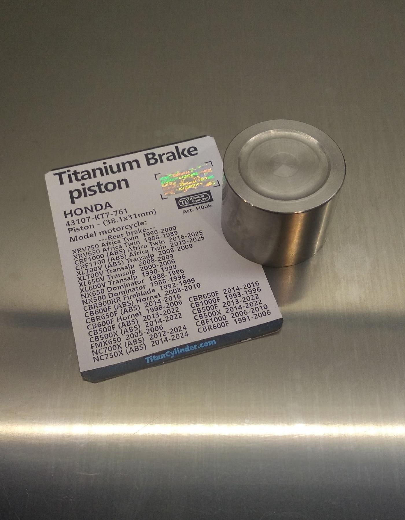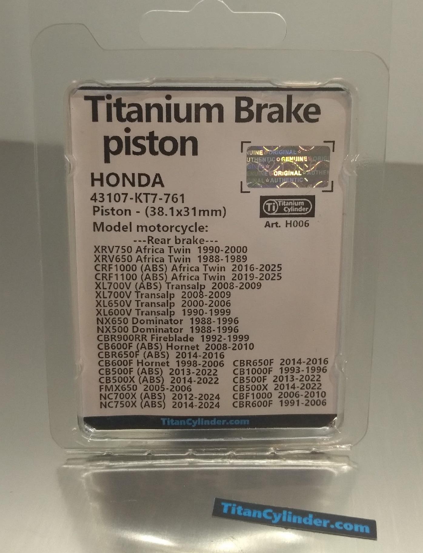 Титановый тормозной поршень. 43107-KT7-761 Piston - (38.1x31mm) Подходит на задний тормозной суппорт: XRV750 Africa Twin 1990-2000 XRV650 Africa Twin 1988-1989 CRF1000 (ABS) Africa Twin 2016-2025 CRF1100 (ABS) Africa Twin 2019-2025 XL700V (ABS) Transalp 2008-2009 XL700V Transalp 2008-2009 XL650V Transalp 2000-2006 XL600V Transalp 1990-1999 NX650 Dominator 1988-1996 NX500 Dominator 1988-1996 CBR900RR Fireblade 1992-1999 CB600F (ABS) Hornet 2008-2010 CBR650F (ABS) 2014-2016 CB600F Hornet 1998-2006 CB500F (ABS) 2013-2022 CB500X (ABS) 2014-2022 FMX650 2005-2006 NC700X (ABS) 2012-2024 NC750Х (ABS) 2014-2024 CBR650F 2014-2016 CB1000F 1993-1996 CB500F 2013-2022 CB500X 2014-2022 CBF1000 2006-2010 CBR600F 1991-2006