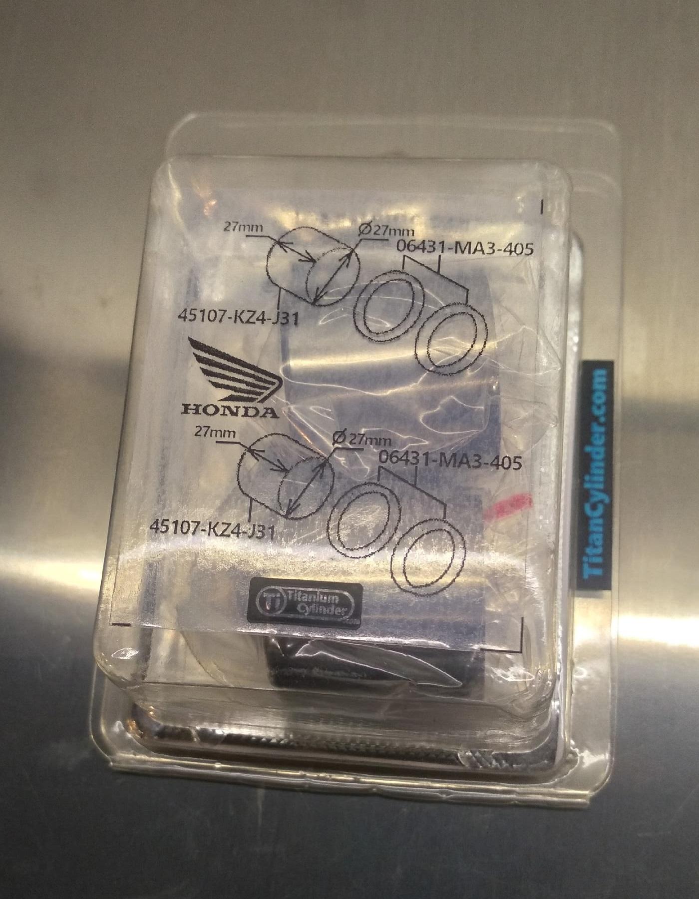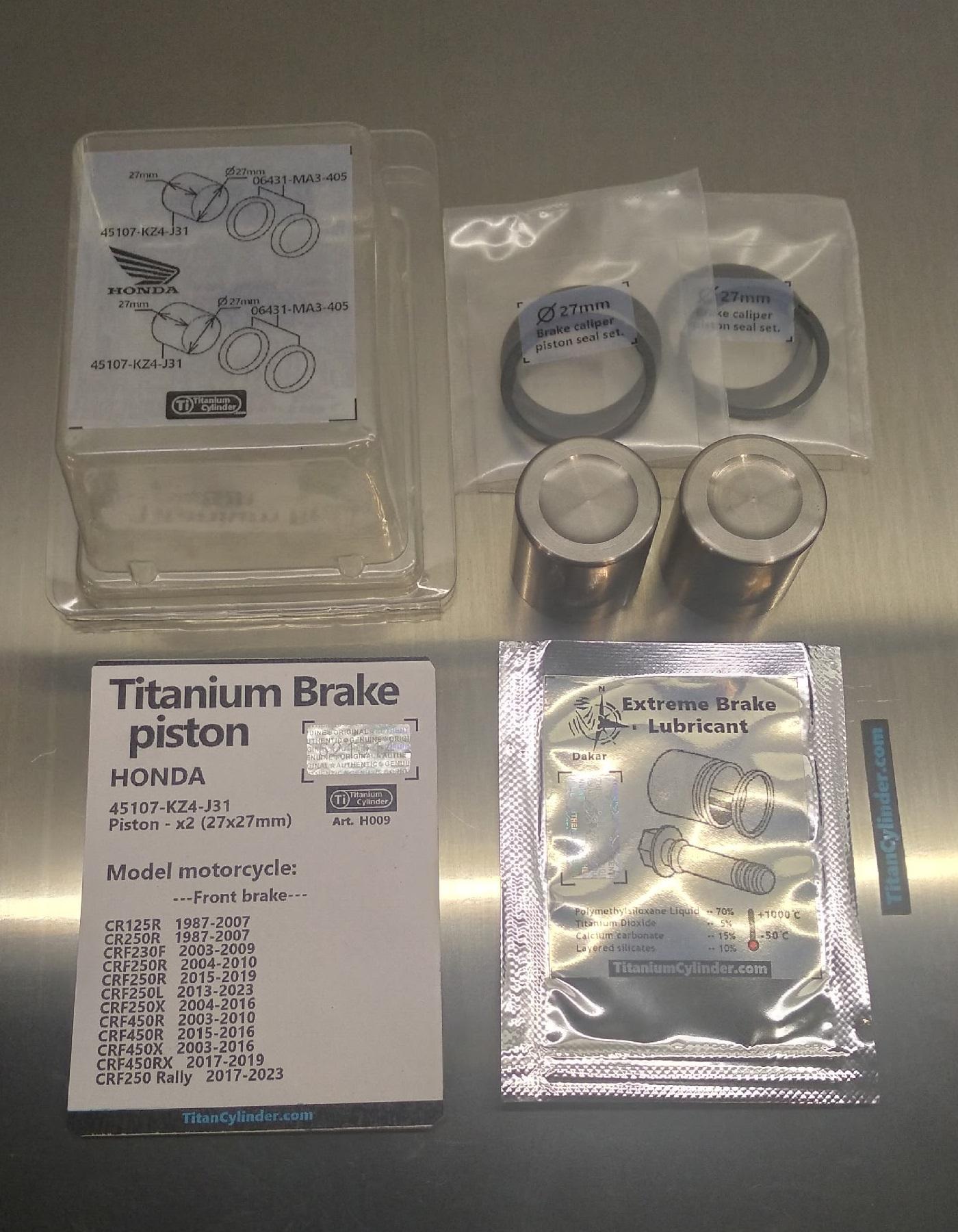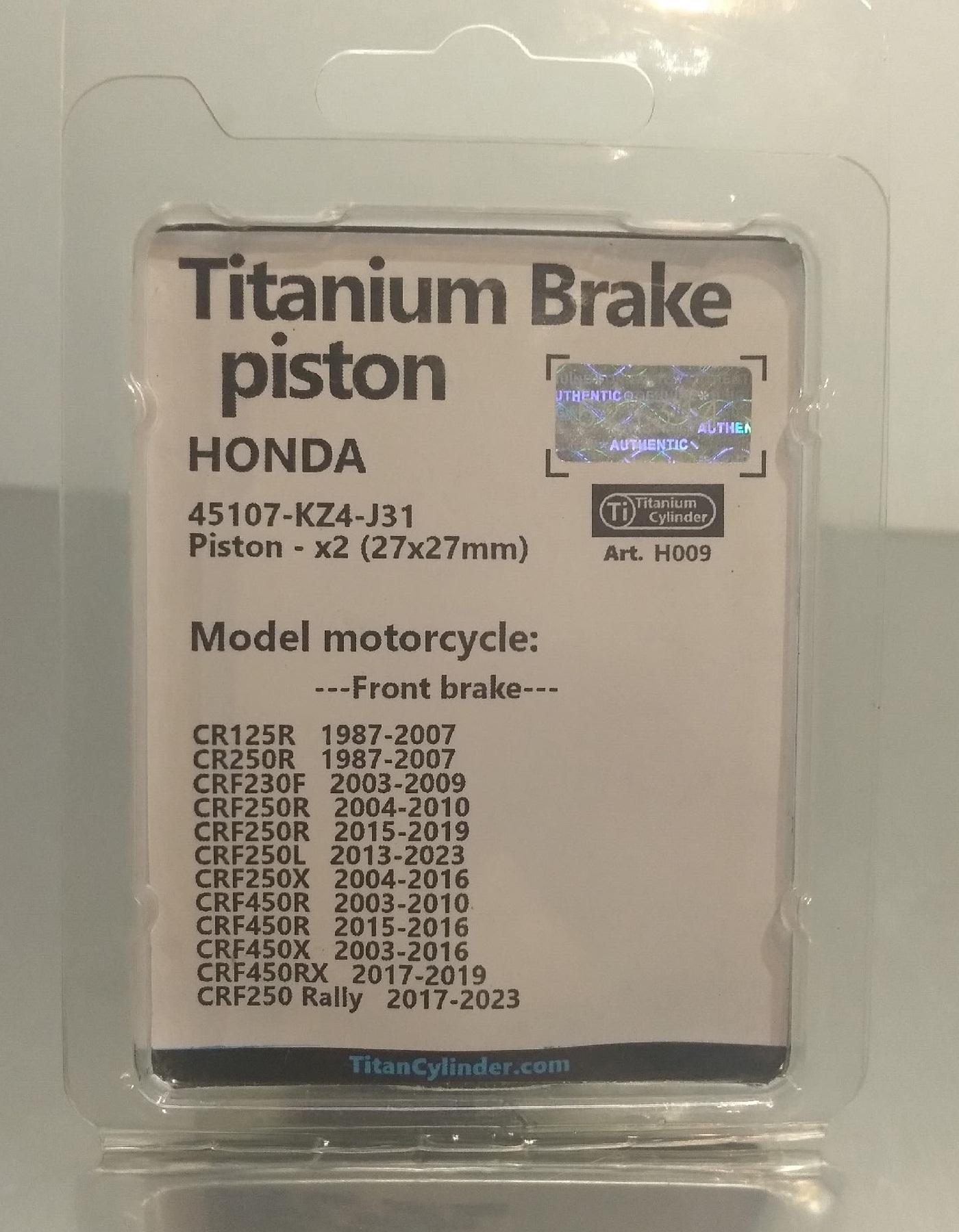 Титановые тормозные поршни. Honda 45107-KZ4-J31 (27x27mm) -2шт Подходит на передний тормозной суппорт: CR125R 1987-2007 CR250R 1987-2007 CRF230F 2003-2009 CRF250R 2004-2010 CRF250R 2015-2019 CRF250L 2013-2023 CRF250X 2004-2016 CRF450R 2003-2010 CRF450R 2015-2016 CRF450X 2003-2016 CRF450RX 2017-2019 CRF250 Rally 2017-2023