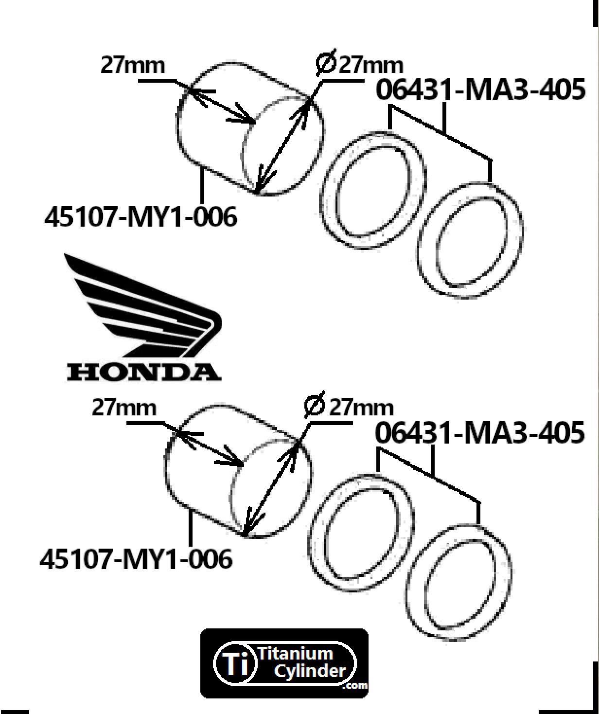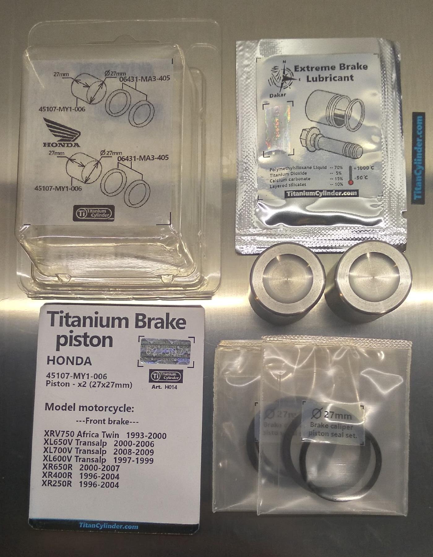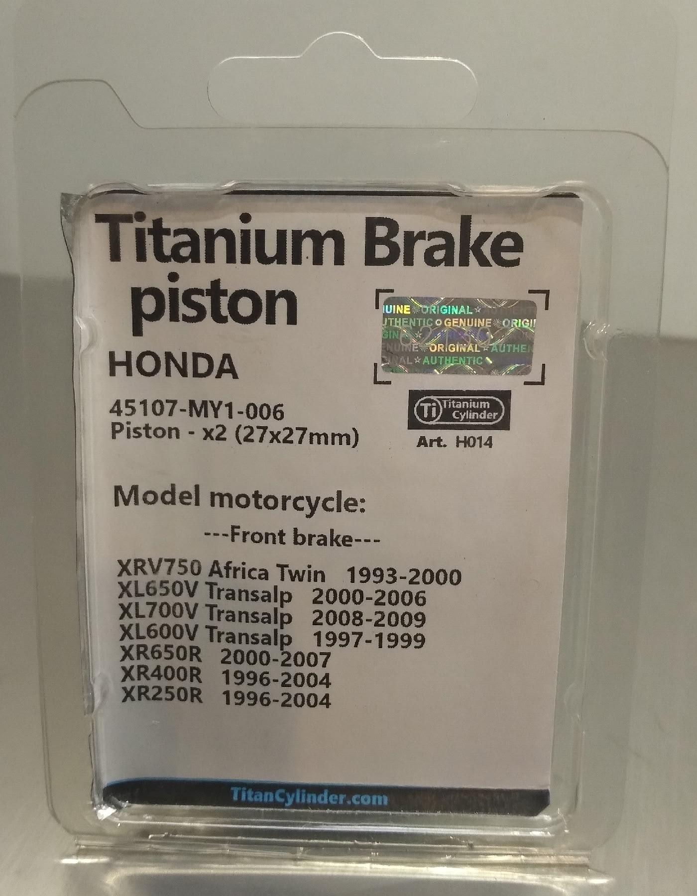 Титановые тормозные поршни. Honda 45107-MY1-006 (27x27mm) -2шт Подходит на передний тормозной суппорт: XRV750 Africa Twin 1993-2000 XL650V Transalp 2000-2006 XL700V Transalp 2008-2009 XL600V Transalp 1997-1999 XR650R 2000-2007 XR400R 1996-2004 XR250R 1996-2004