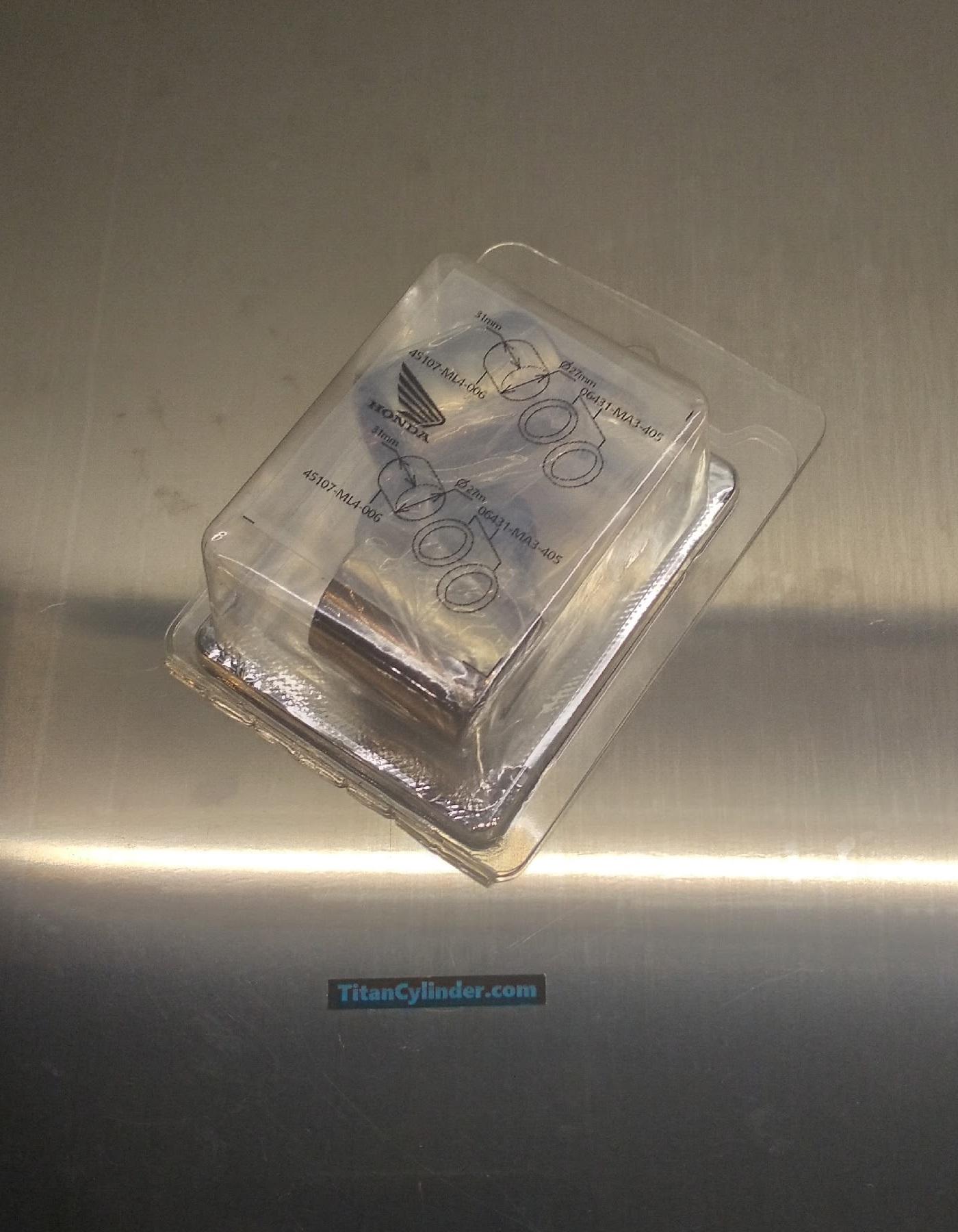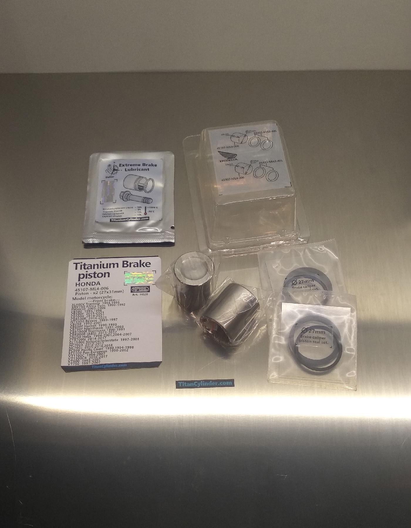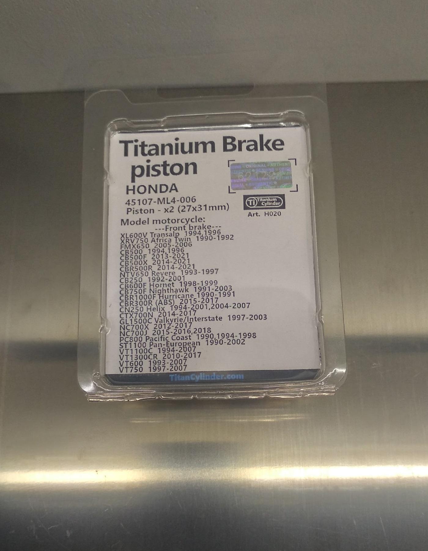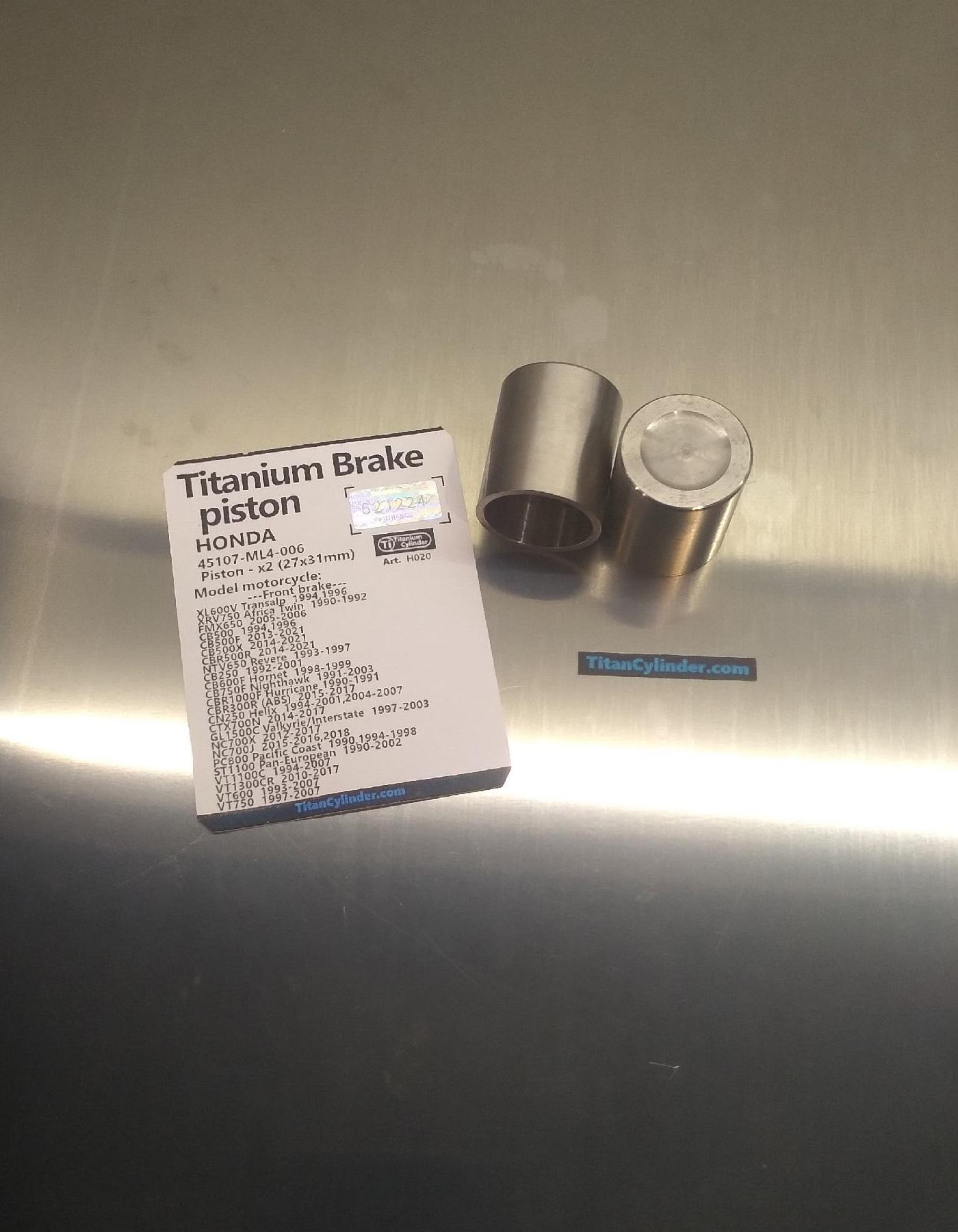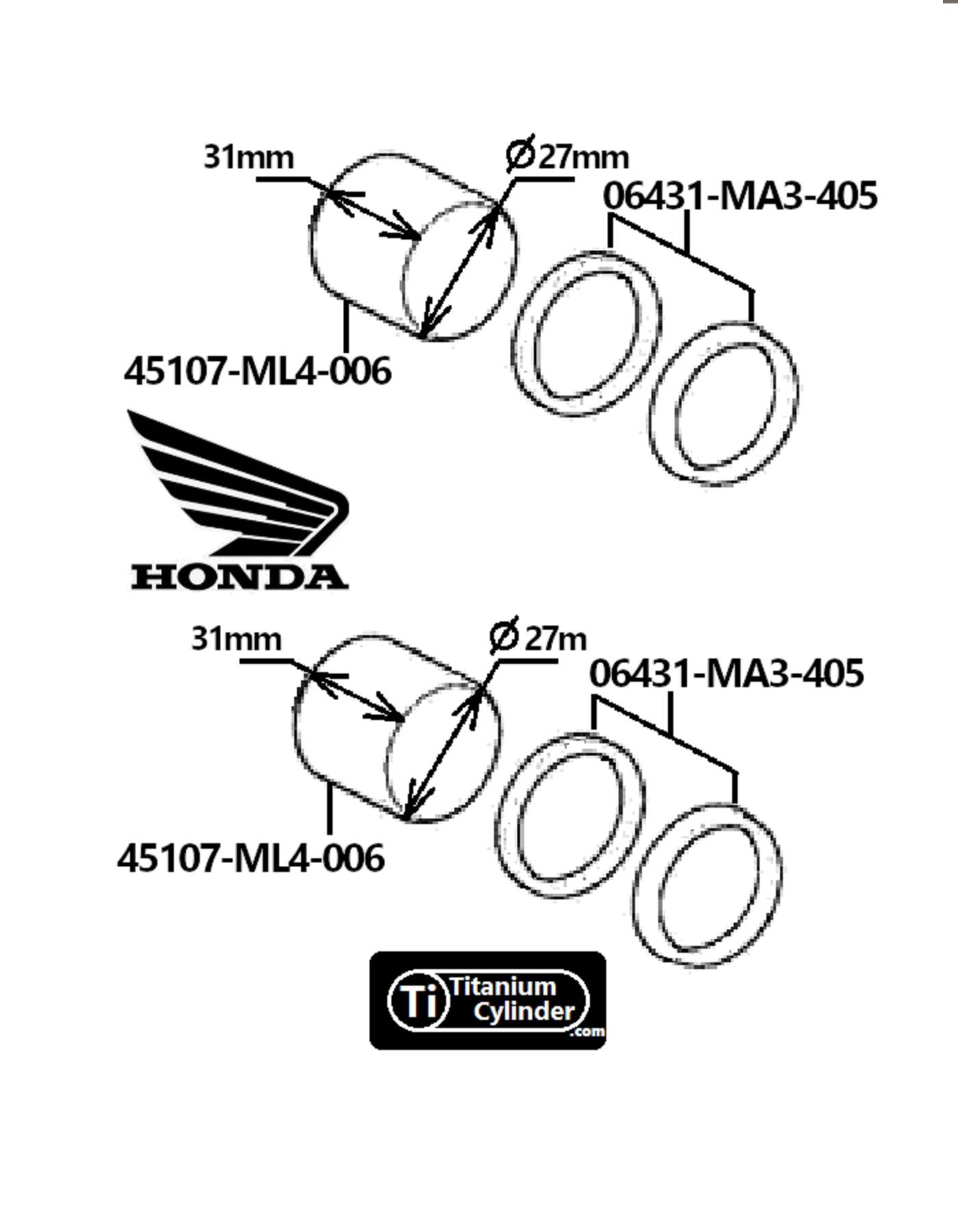 Комплект титановых тормозных поршней. Honda 45107-ML4-006 поршень (27x31mm) - 2шт Подходит на передний тормозной суппорт: XL600V Transalp 1994,1996 XRV750 Africa Twin 1990-1992 FMX650 2005-2006 CB500 1994,1996 CB500F 2013-2021 CB500X 2014-2021 CBR500R 2014-2021 NTV650 Revere 1993-1997 CB250 1992-2001 CB600F Hornet 1998-1999 CB750F Nighthawk 1991-2003 CBR1000F Hurricane 1990-1991 CBR300R (ABS) 2015-2017 CN250 Helix 1994-2001,2004-2007 CTX700N 2014-2017 GL1500C Valkyrie/Interstate 1997-2003 NC700X 2012-2017 NC700J 2015-2016,2018 PC800 Pacific Coast 1990,1994-1998 ST1100 Pan-European 1990-2002 VT1100C 1994-2007 VT1300CR 2010-2017 VT600 1993-2007 VT750 1997-2007 --- Рекомендуем перед покупкой измерить свой старый тормозной поршень. Мы указываем размеры поршней на обложке, размеры являются ознакомительными - без сотых миллиметра, но более чем достаточны для того что бы Вы убедились в совместимости ваших моделей. ---