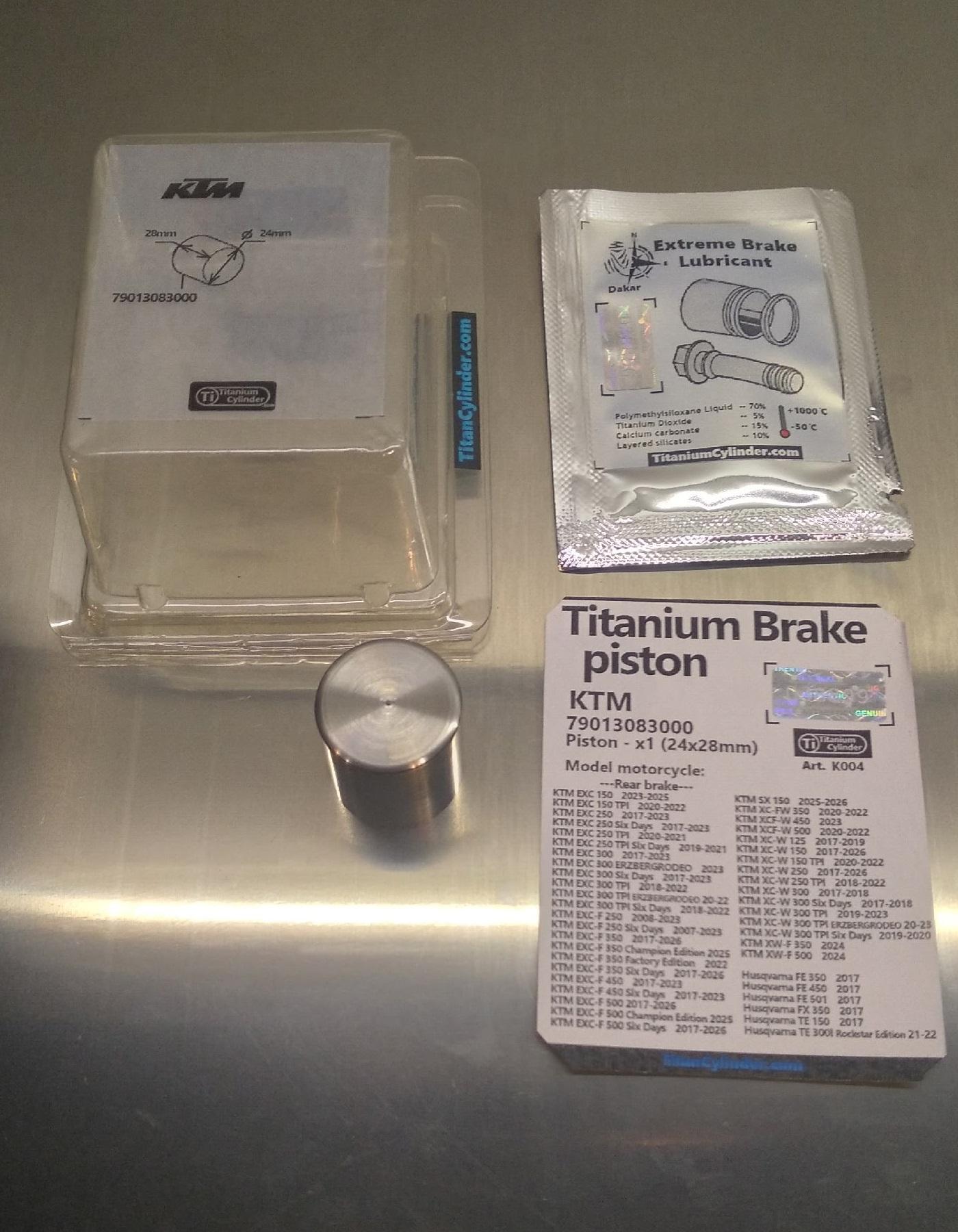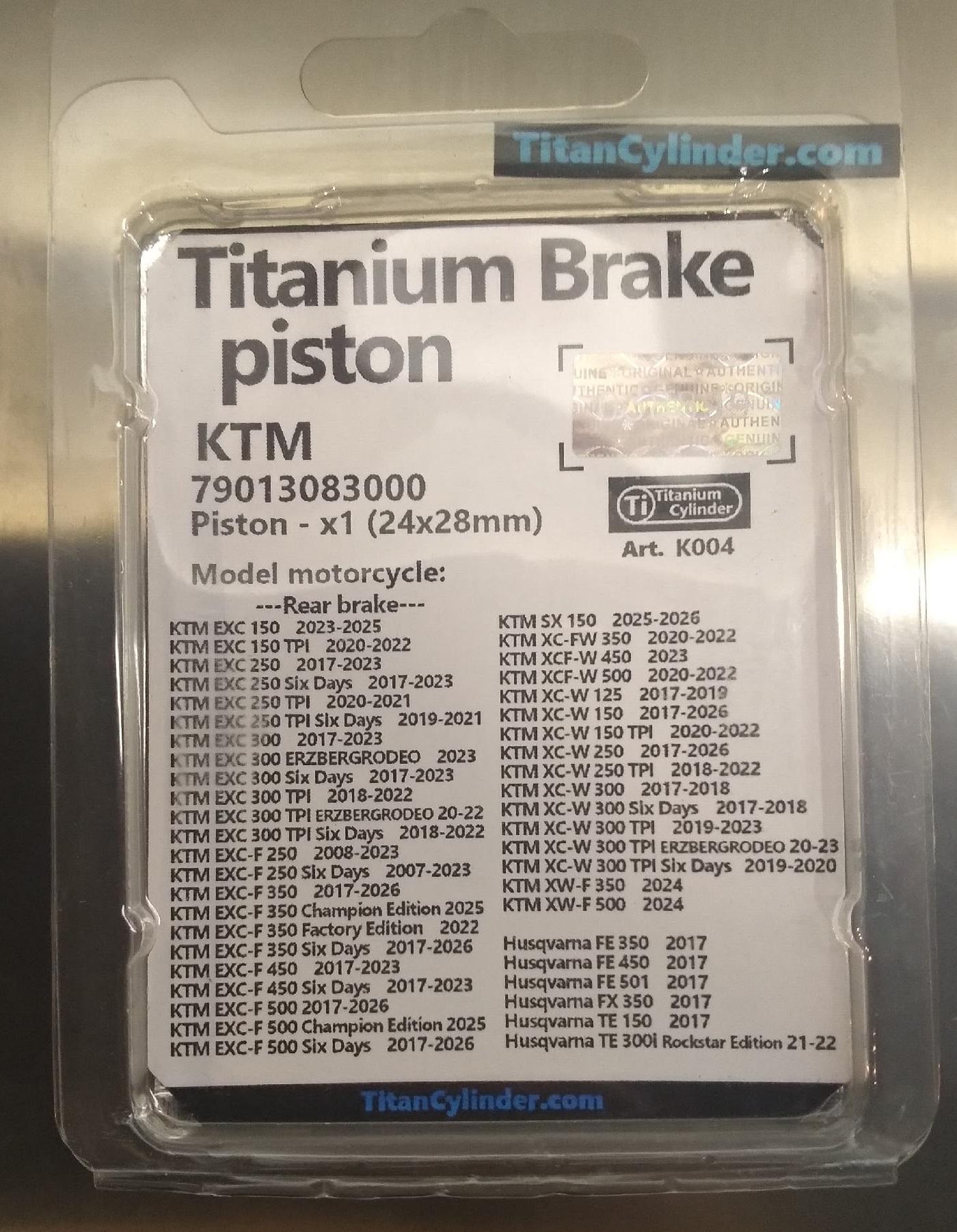 Титановый тормозной поршень. KTM 79013083000 (24x28mm) - 1шт Подходит на задний тормозной суппорт: KTM EXC 150 2023-2025 KTM EXC 150 TPI 2020-2022 KTM EXC 250 2017-2023 KTM EXC 250 Six Days 2017-2023 KTM EXC 250 TPI 2020-2021 KTM EXC 250 TPI Six Days 2019-2021 KTM EXC 300 2017-2023 KTM EXC 300 ERZBERGRODEO 2023 KTM EXC 300 Six Days 2017-2023 KTM EXC 300 TPI 2018-2022 KTM EXC 300 TPI ERZBERGRODEO 20-22 KTM EXC 300 TPI Six Days 2018-2022 KTM EXC-F 250 2008-2023 KTM EXC-F 250 Six Days 2007-2023 KTM EXC-F 350 2017-2026 KTM EXC-F 350 Champion Edition 2025 KTM EXC-F 350 Factory Edition 2022 KTM EXC-F 350 Six Days 2017-2026 KTM EXC-F 450 2017-2023 KTM EXC-F 450 Six Days 2017-2023 KTM EXC-F 500 2017-2026 KTM EXC-F 500 Champion Edition 2025 KTM EXC-F 500 Six Days 2017-2026 KTM SX 150 2025-2026 KTM XC-FW 350 2020-2022 KTM XCF-W 450 2023 KTM XCF-W 500 2020-2022 KTM XC-W 125 2017-2019 KTM XC-W 150 2017-2026 KTM XC-W 150 TPI 2020-2022 KTM XC-W 250 2017-2026 KTM XC-W 250 TPI 2018-2022 KTM XC-W 300 2017-2018 KTM XC-W 300 Six Days 2017-2018 KTM XC-W 300 TPI 2019-2023 KTM XC-W 300 TPI ERZBERGRODEO 20-23 KTM XC-W 300 TPI Six Days 2019-2020 KTM XW-F 350 2024 KTM XW-F 500 2024 Husqvarna FE 350 2017 Husqvarna FE 450 2017 Husqvarna FE 501 2017 Husqvarna FX 350 2017 Husqvarna TE 150 2017 Husqvarna TE 300i Rockstar Edition 21-22